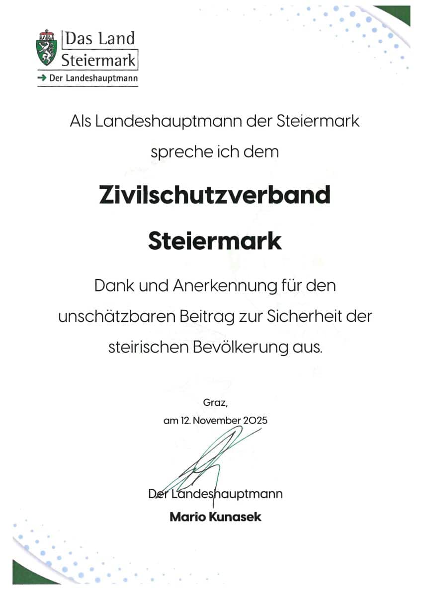 Landeshauptmann Mario Kunasek bedankte sich im Anschluss an die Pressekonferenz für das tagtägliche Engagement: „Der Zivilschutzverband Steiermark leistet einen unschätzbaren Beitrag zur Sicherheit und Vorsorge in unserem Bundesland. Durch seine engagierte Arbeit wird das Bewusstsein für Selbstschutz und Katastrophenvorsorge in der Bevölkerung nachhaltig gestärkt. Ein herzliches Dankeschön an alle Beteiligten, die Zivilschutz ermöglichen – für ihre Professionalität, ihren Teamgeist und ihren unermüdlichen Einsatz zum Wohl der steirischen Bevölkerung.”